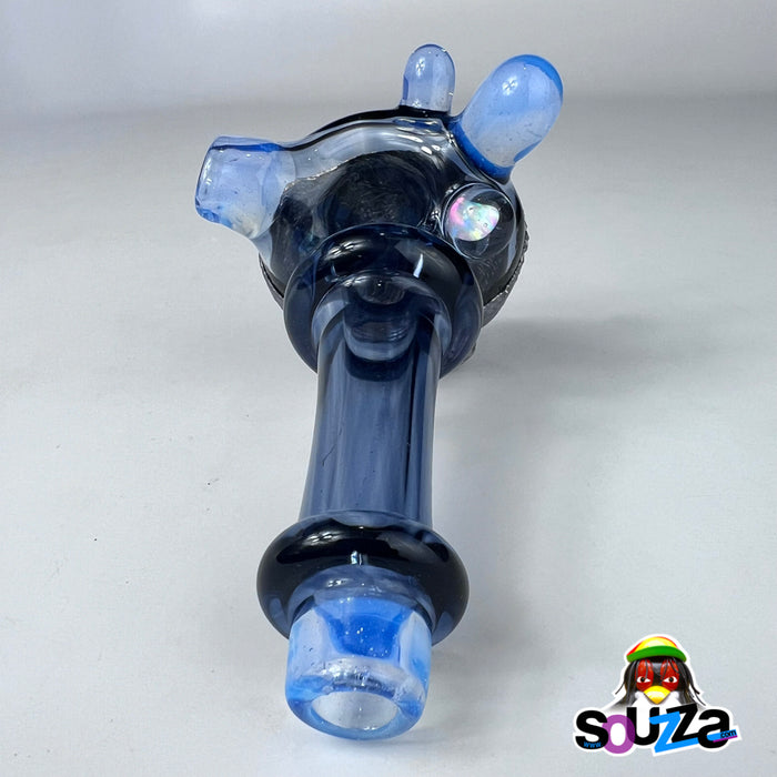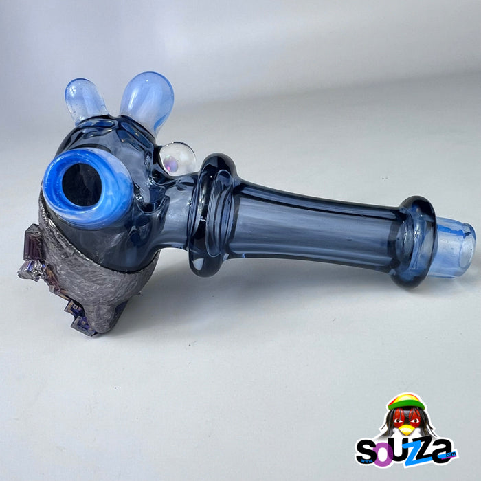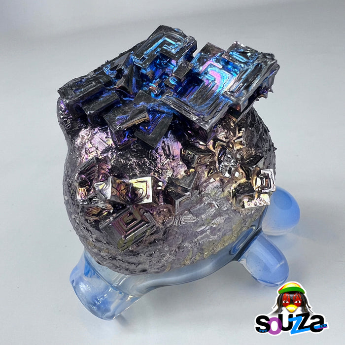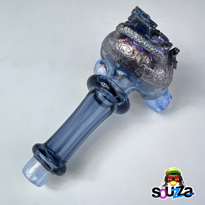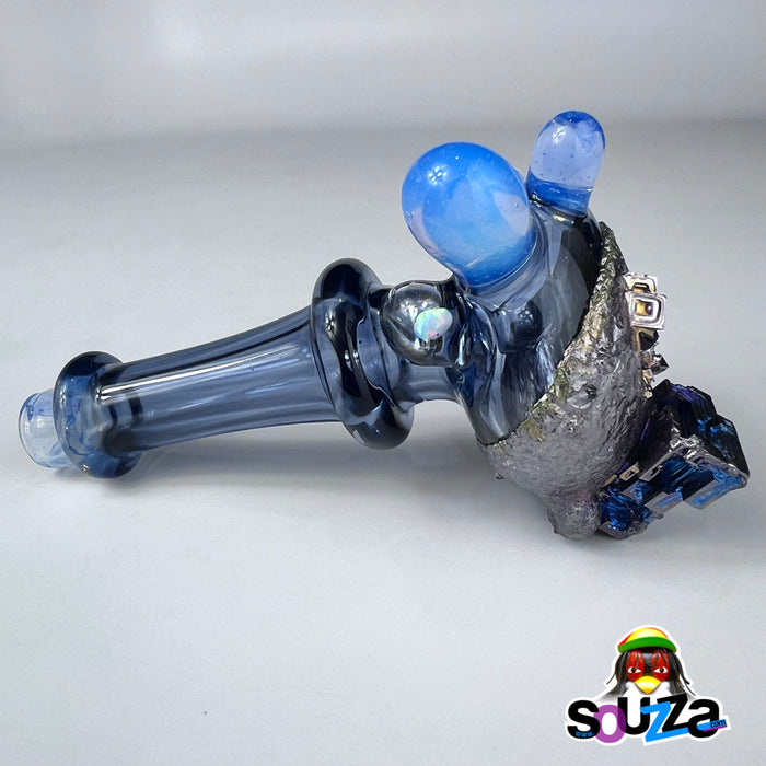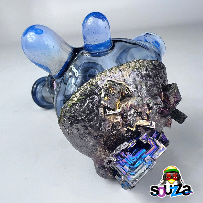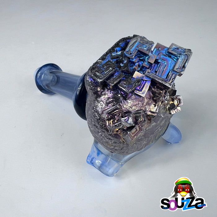 Crafted with cosmic energy and mineral magic, this Bismuth Spoon Pipe by Bash Glassworks is a mind-melting fusion of art and alchemy. The deep blue borosilicate body is met with a bold bismuth finish — a real crystal formation grown and applied by Bash’s partner, Sydney — creating a textured, futuristic crown that catches light from every angle. A fire opal cab rests on the side, glowing with layered color. Signed and shaped with Bash’s signature polish, this one-of-a-kind piece is more than a spoon — it’s a statement.