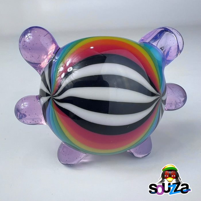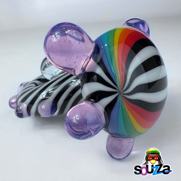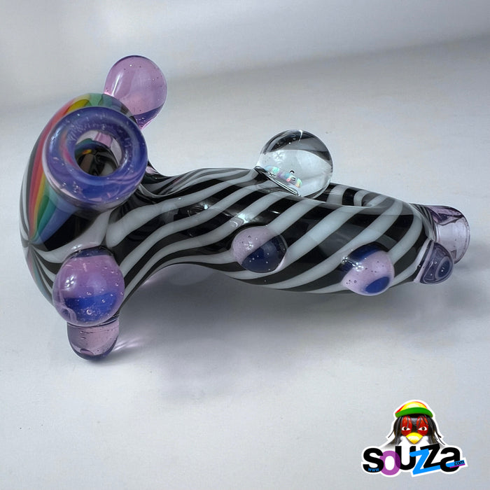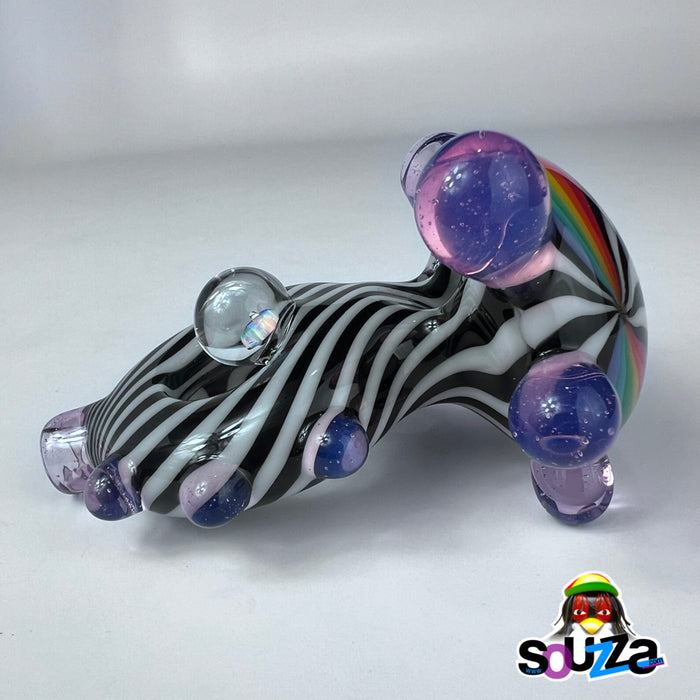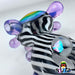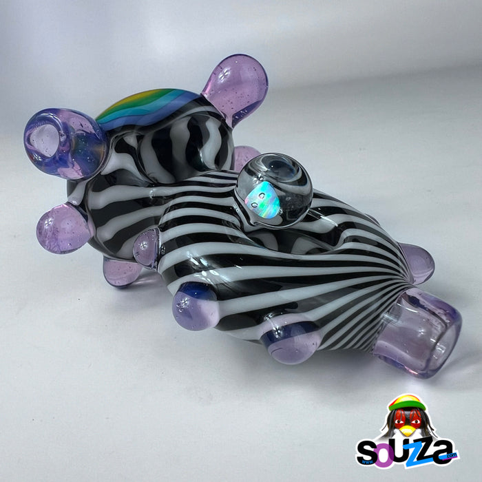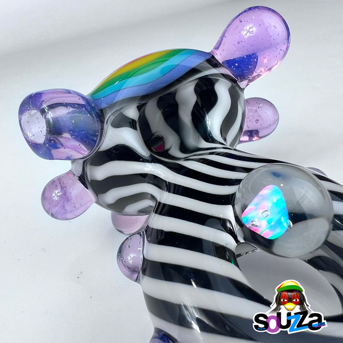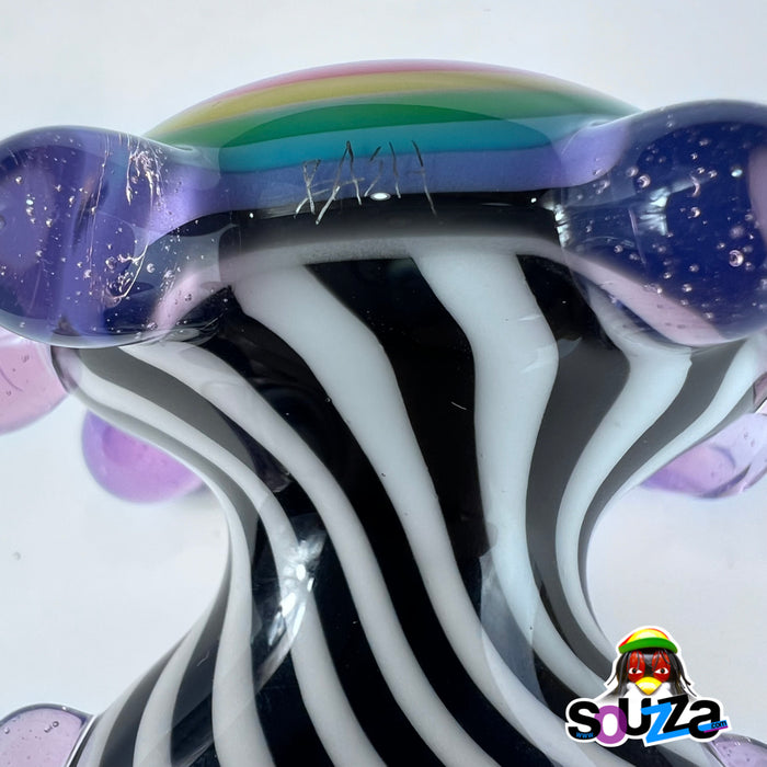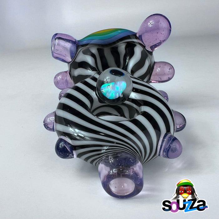 Step into the wild side of glass art with this hand-sculpted Opal Zebra Donut Spoon Pipe by Bash Glassworks. Featuring bold, hypnotic zebra striping wrapped around a perfectly shaped donut form, this piece balances playful energy with refined craftsmanship. Accented with shimmering purple nubs and a beautifully placed crushed opal cab, this pipe isn’t just for function—it’s for flaunting.