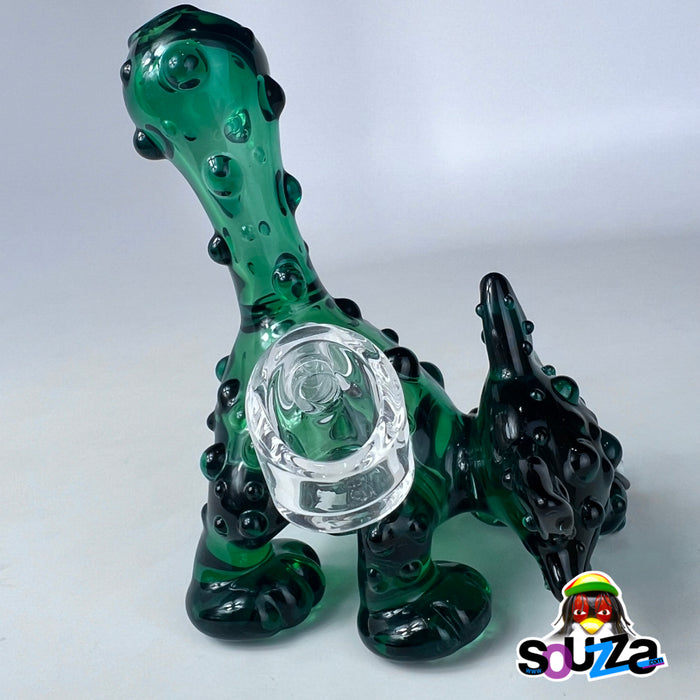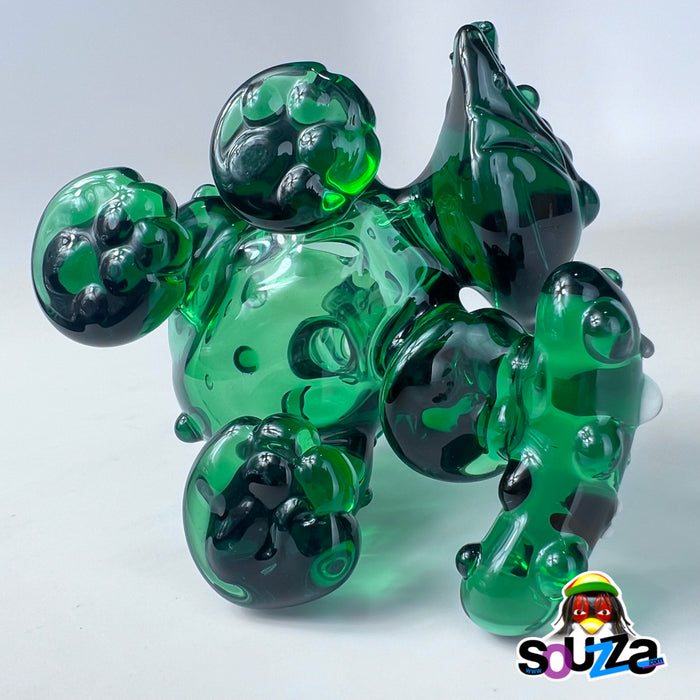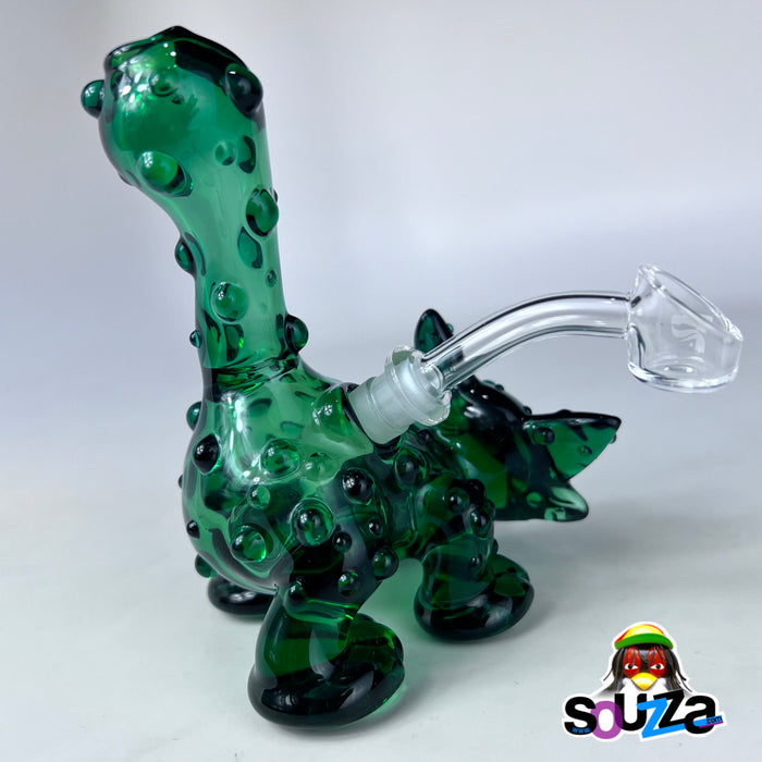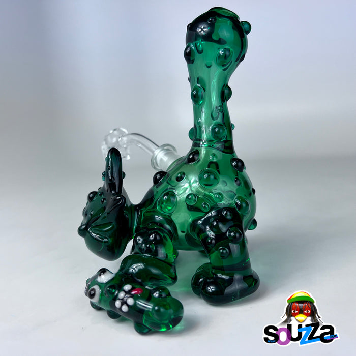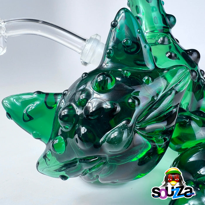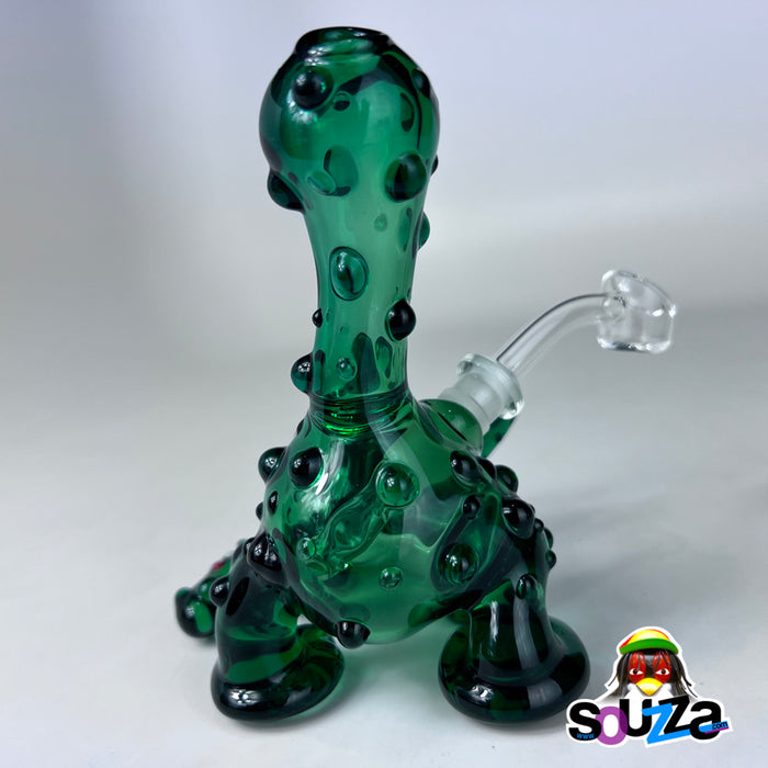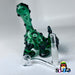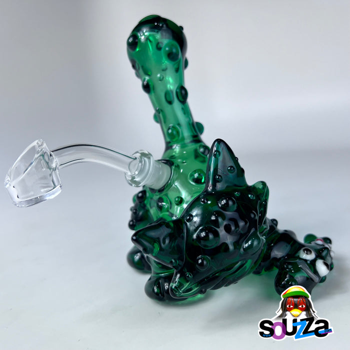 Built from rich green borosilicate with black accents and bubbled texture throughout, this rig is more than fun — it's flame-forged craftsmanship. It comes complete with a custom-shaped short downstem and a 10mm 45° quartz banger nail, making it fully functional and ready to rip.