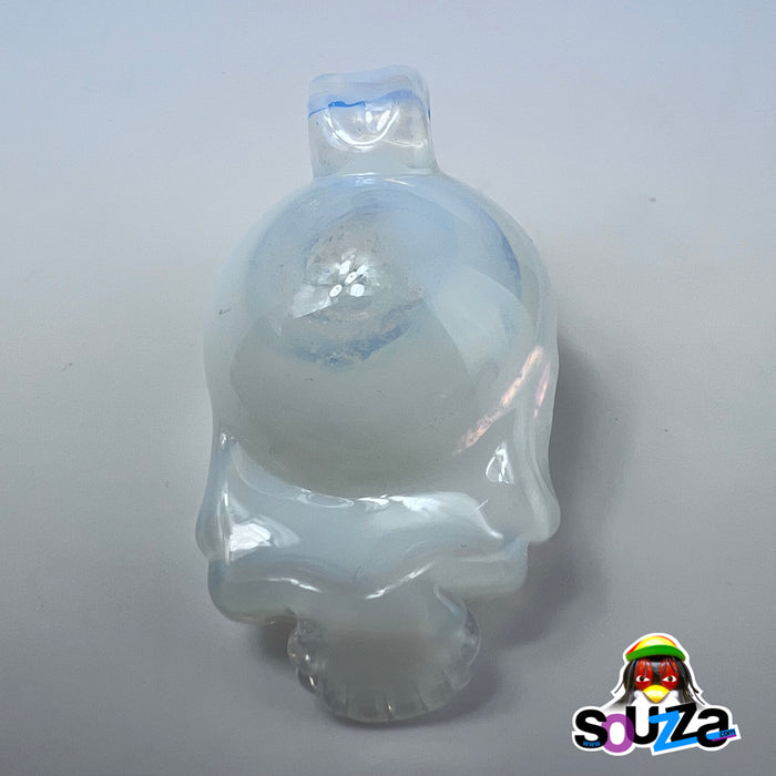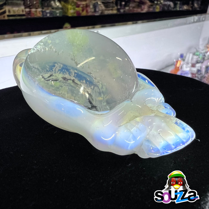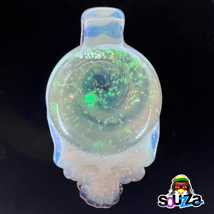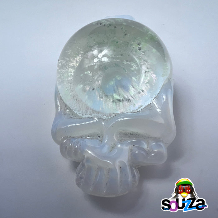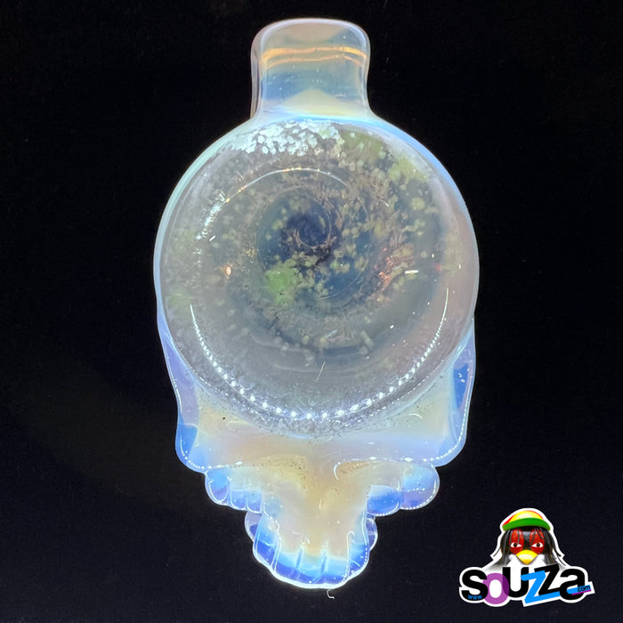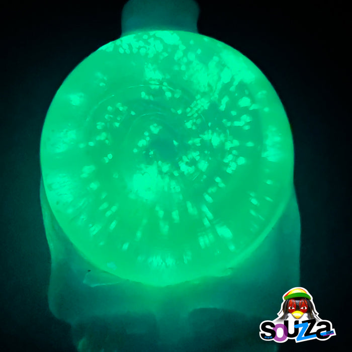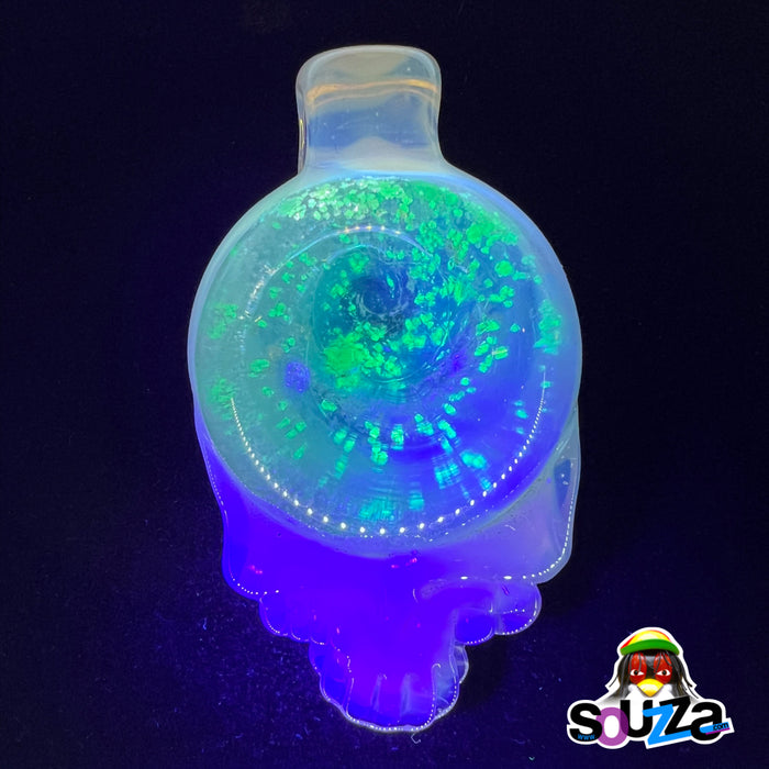 Rhythm Glass delivers cosmic energy with this Extra Large Dichro Glow Stealie Pendant — a radiant fusion of heady art and wearable statement piece. Crafted in shimmering dichroic layers and sculpted into the iconic Stealie skull form, this pendant reveals new dimensions under UV light, exploding with bright, ethereal glow.